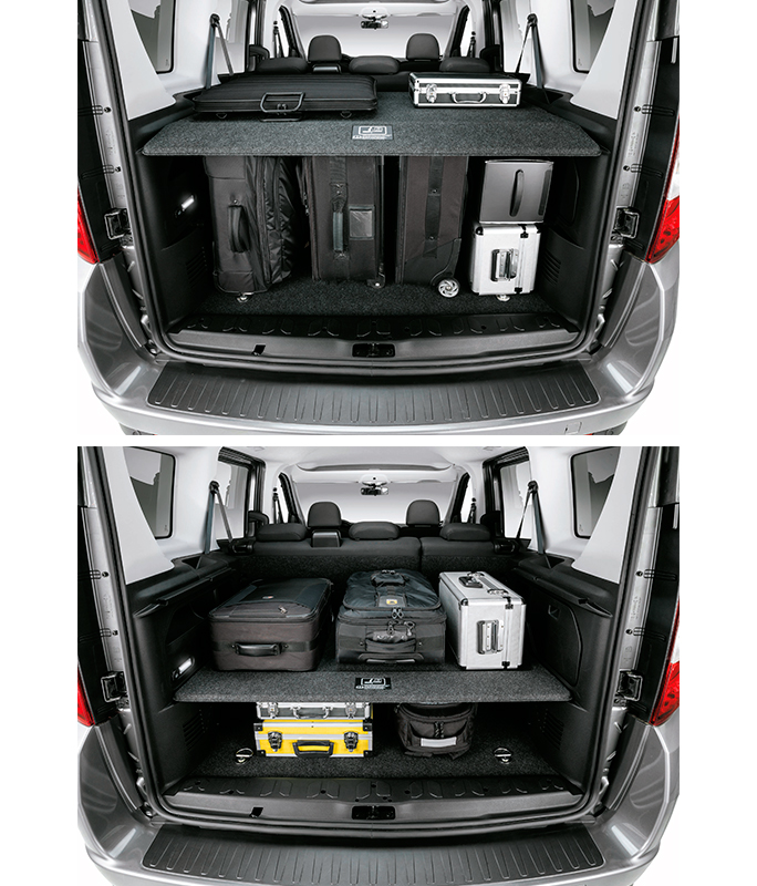 В базовой версии багажный отсек закрыт мягкой шторкой. По заказу может быть оснащен жесткой полкой, которая может быть установлена в двух положениях или полностью снята. В нижнем положении полка способна выдерживать нагрузку до 70кг. Для удобства крепления тяжелого груза пол багажника оснащен такелажными петлями.